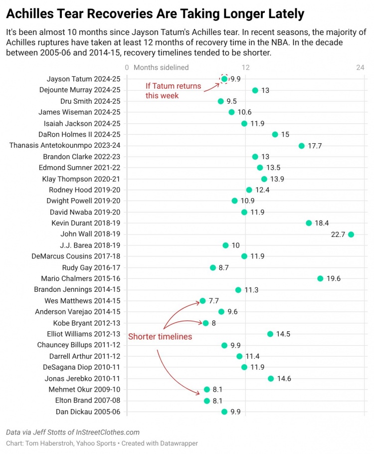 3月5日讯 雅虎体育记者Tom Haberstroh今日晒出一份球星跟腱撕裂(断裂)伤病的恢复数据。